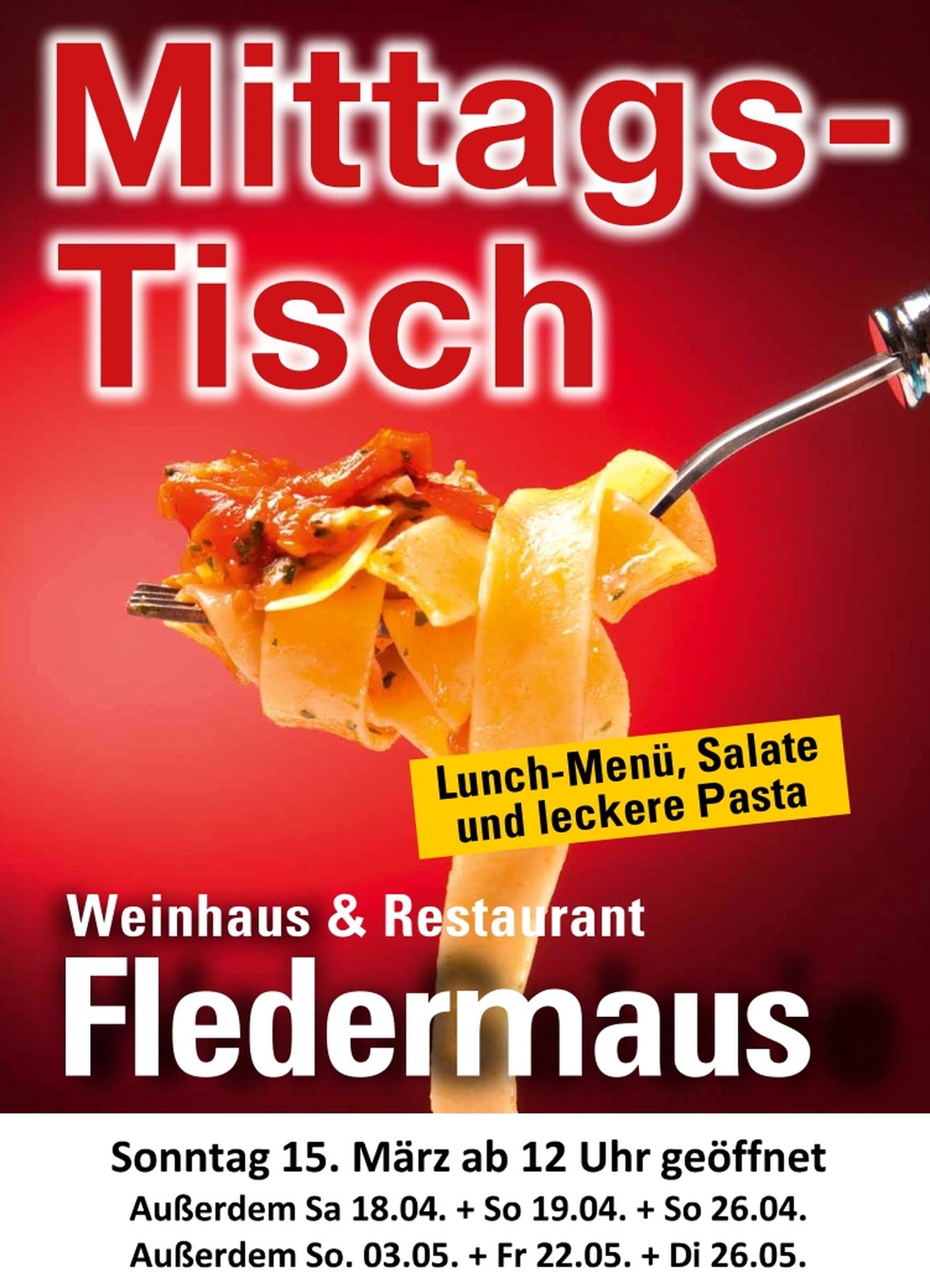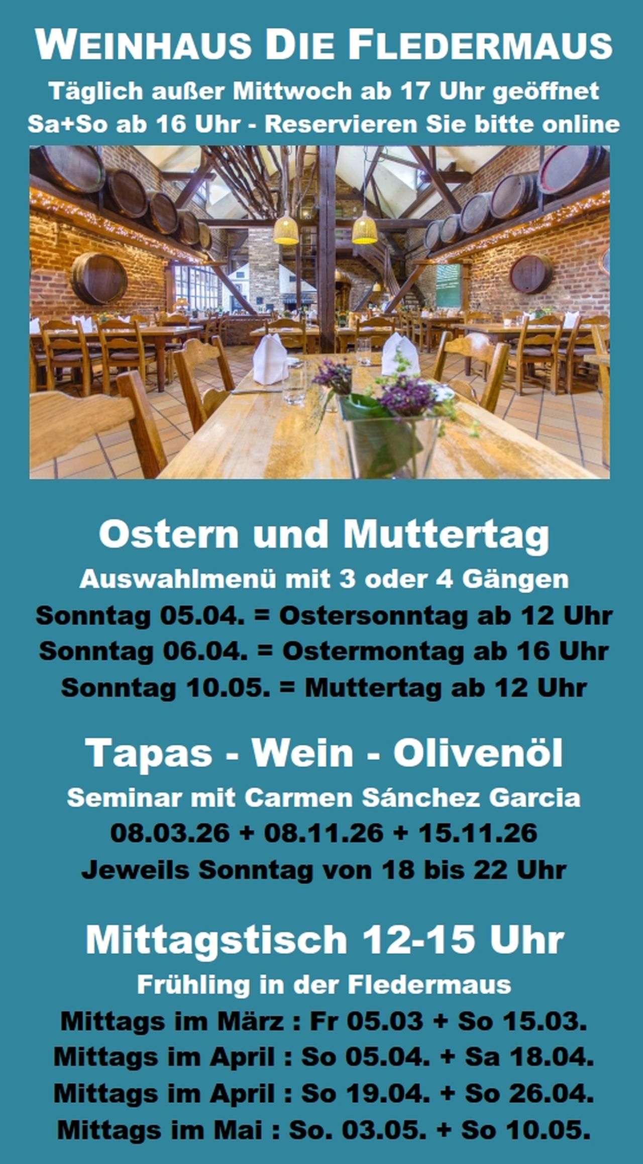 Bestellungen für den gleichen Tag müssen am Wochenende bis spätestens 17 Uhr per Email eingehen an info@weinhausfledermaus.de oder per Telefon unter 02238-59600. Mittwoch ist unser Ruhetag. An Weihnachten und Silvester sind keine Abholungen möglich.