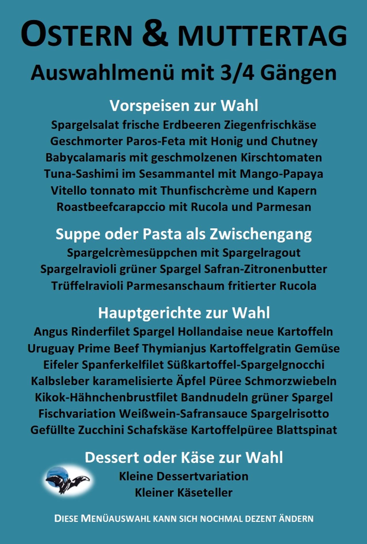 Ostern und Muttertag gibt es ausschließlich unser Auswahlmenü. Bestellungen a la Carte sind nicht möglich.